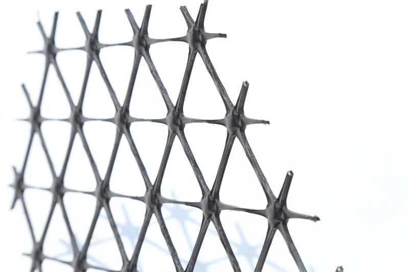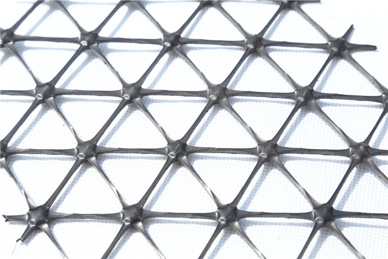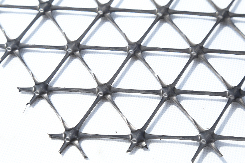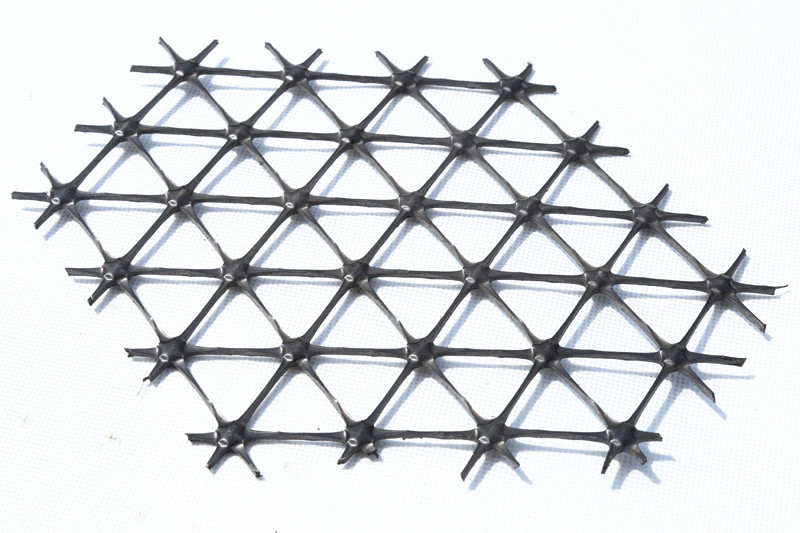 多向拉伸塑料土工格栅,其特征在于土工格栅内的格栅孔的形状为三角形,土工格栅通过挤压一体成型。所述土工格栅孔的交接处设有圆形减重孔。所述土工格栅的材质为聚丙烯。本实用新型设计巧妙、简单使用、通过改变格栅孔的形状进而改变格栅的引力拉伸方向,在实际工程应用中,能适应不同环境的需要,提高了路基承载能力,并能延长路基的使用寿命。