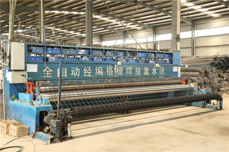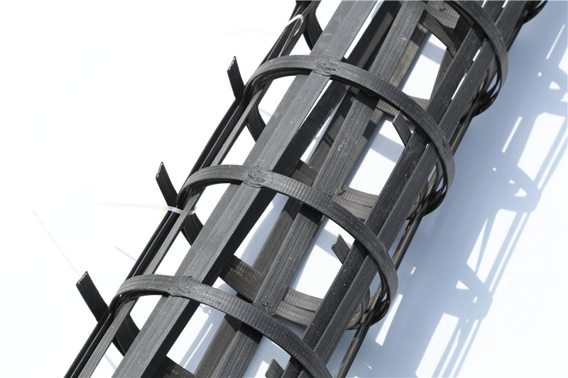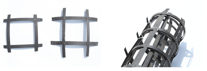 此产品以高强钢丝(或其它纤维),经特殊处理,与聚乙烯(PE),并添加其它助剂,通过挤出使之成为复合型高强抗拉条带,且表面有粗糙压纹,则为高强加筋土工带。由此单带,经纵、横按一定间距编织或夹合排列,采用特殊强化粘接的熔焊技术焊接其交接点而成型,则为加筋土工格栅。